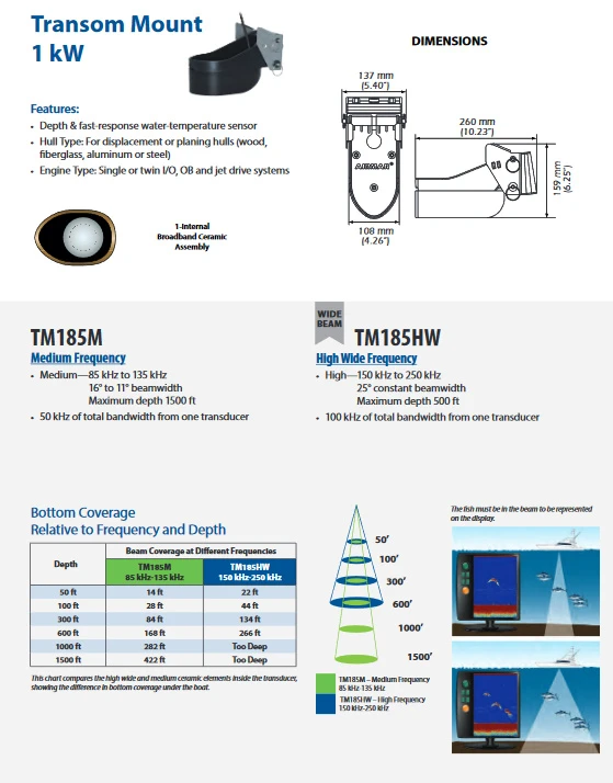 Der XSonic TM185 HW von Airmar ist ein Sonarsensor für CHIRP. Er ist mit einem Urethan-Gehäuse und einer Edelstahl-Halterung ausgestattet. Er verfügt über einen Tiefen- und einen schnell ansprechenden Wassertemperatursensor.CHIRPS über folgende Bandbreiten:Hochfrequenz: 150-250 kHz 25° konstante StrahlbreiteBootsgröße: 8 m bis 12 m (25’ bis 40’)Boottyp: Außenborder und I/ORumpftyp: Fiberglas, Holz, MetallKann an bestehenden TM258-, TM260-, TM265- und TM275-Halterungen nachgerüstet werden- Abmessungen: – B x H x T108 x 191 x 74 mm (B, L, T) (4,3 x 7,5 x 2,9″) ohne Halterung- Frequenzen: 150-250 kHz- Maximale Tiefe: 150 m (500 ft) je nach Sonar- Gewicht: 4 kg (8.9 lb)