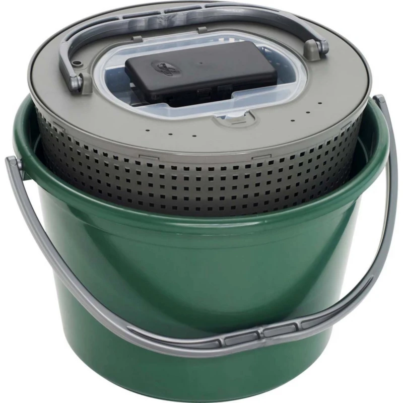 Robuster Eimer zur optimalen Aufbewahrung von Köderfischen. Herausnehmbarer Inneneimer aus starkem Kunststoffnetz mit Deckel. Diese Konstruktion ermöglicht einen einfachen Wasserwechsel und macht es leicht, an die Köderfische heranzukommen. Der Inneneimer kann auch direkt im Wasser gehalten werden, damit der Köderfisch Zugang zu frischem und sauerstoffreichem Wasser hat. 18 Liter.