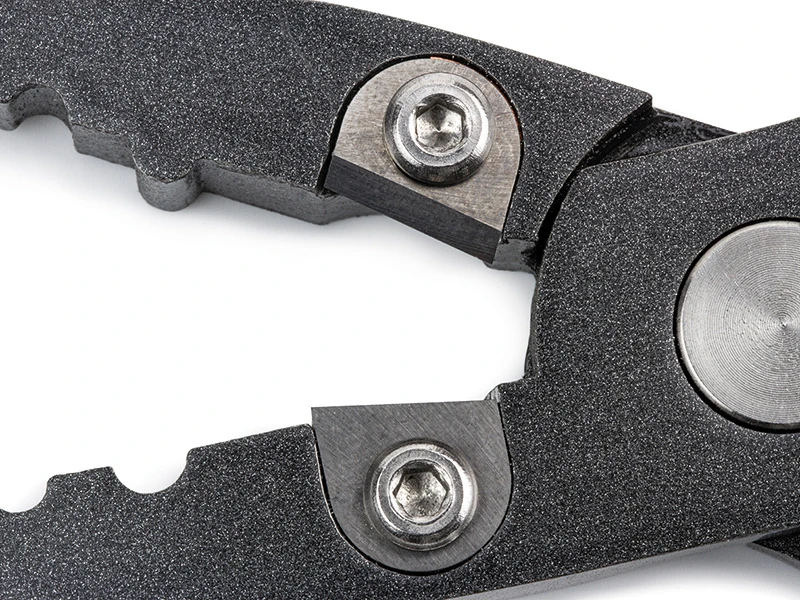 Der kleine „Schnabel“ an einer der beiden Klemmen ermöglicht es dem Angler, die gespaltenen Ringe ohne große Anstrengung zu öffnen. Der ergonomisch geformte und erleichterte Griff sorgt für einen einfachen und festen Halt. Die speziellen Schneideklingen aus Wolframkarbid ermöglichen das problemlose Schneiden von geflochtener Schnur und Fluorocarbon.